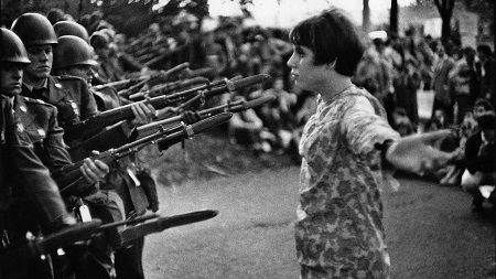 -Enfin Chris MARKER ne se contente pas d'enregistrer ce qu'il voit de la manière la plus réaliste et la plus prenante possible pour en conserver la mémoire. En tant qu'antimilitariste convaincu, il prend parti pour les contestataires et fait de son film un manifeste de résistance à l'oppression illustré par les saisissantes photographies de Marc Riboud montrant une jeune fille donnant une fleur à la rangée de soldats qui pointent leurs fusils sur elle et plusieurs slogans tels que "Si vous donnez tous les pouvoirs aux militaires pour vous défendre, qui vous défendra des militaires?"